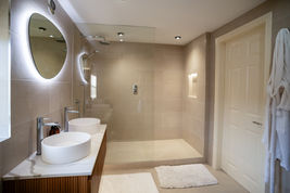 The largest of the three bathrooms was a spacious ensuite with an awkward, underused layout. We reimagined the entire room—installing a large walk-in shower with a bespoke frameless glass panel, a beautiful wall-hung WC, extra built-in storage, and a huge double basin with feature lighting.